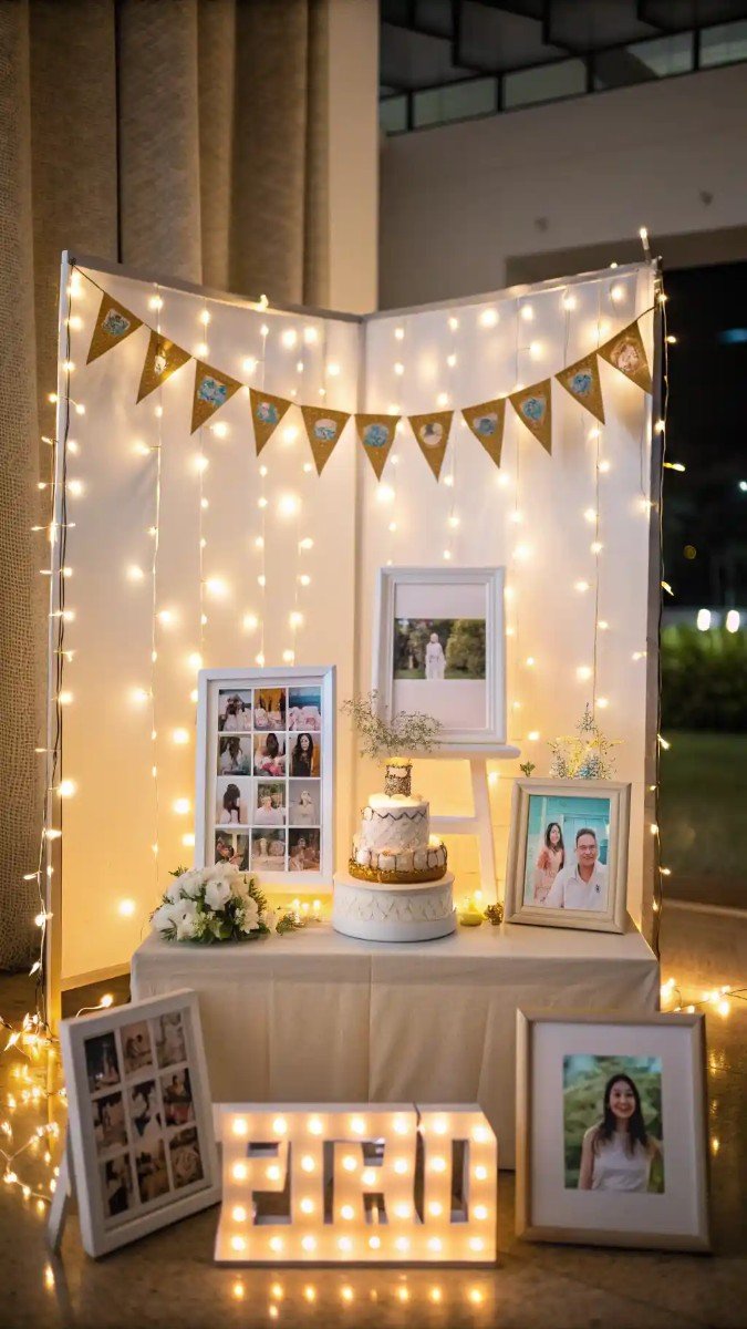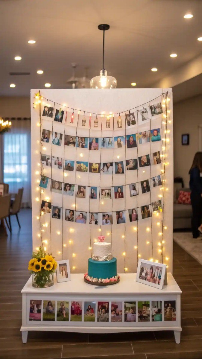 This setup beautifully showcases a curated collection of photographs strung across a backdrop, instantly creating a nostalgic and heartfelt atmosphere. The string lights add a soft, inviting glow, enhancing the celebratory mood. The cake, adorned with a personalized topper, serves as a focal point, and the surrounding floral arrangement and additional photo displays further personalize the living room.