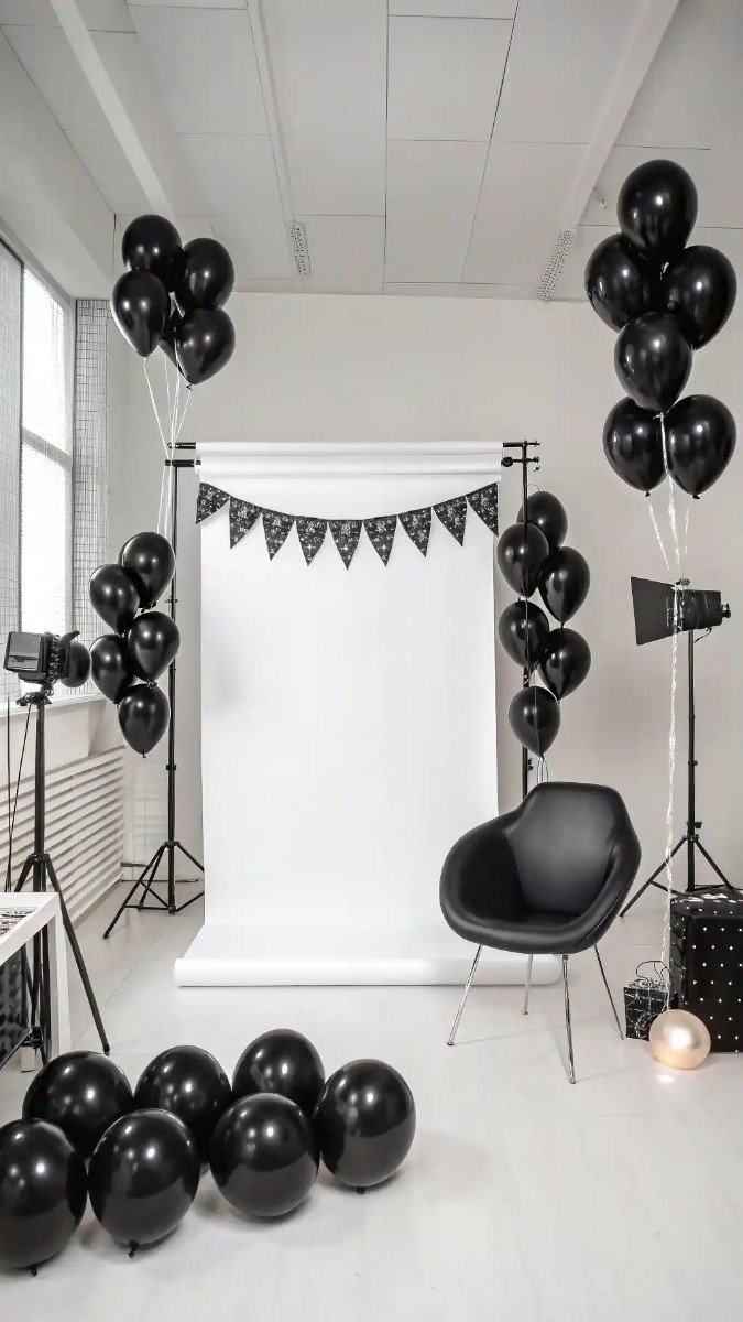 The use of black balloons against the white backdrop creates a striking visual contrast. This minimalist approach exudes modern elegance, avoiding a cluttered feel. Consider incorporating varying balloon sizes and textures for added depth. A simple banner further enhances the celebratory atmosphere, making it perfect for living room birthday decorations for him.