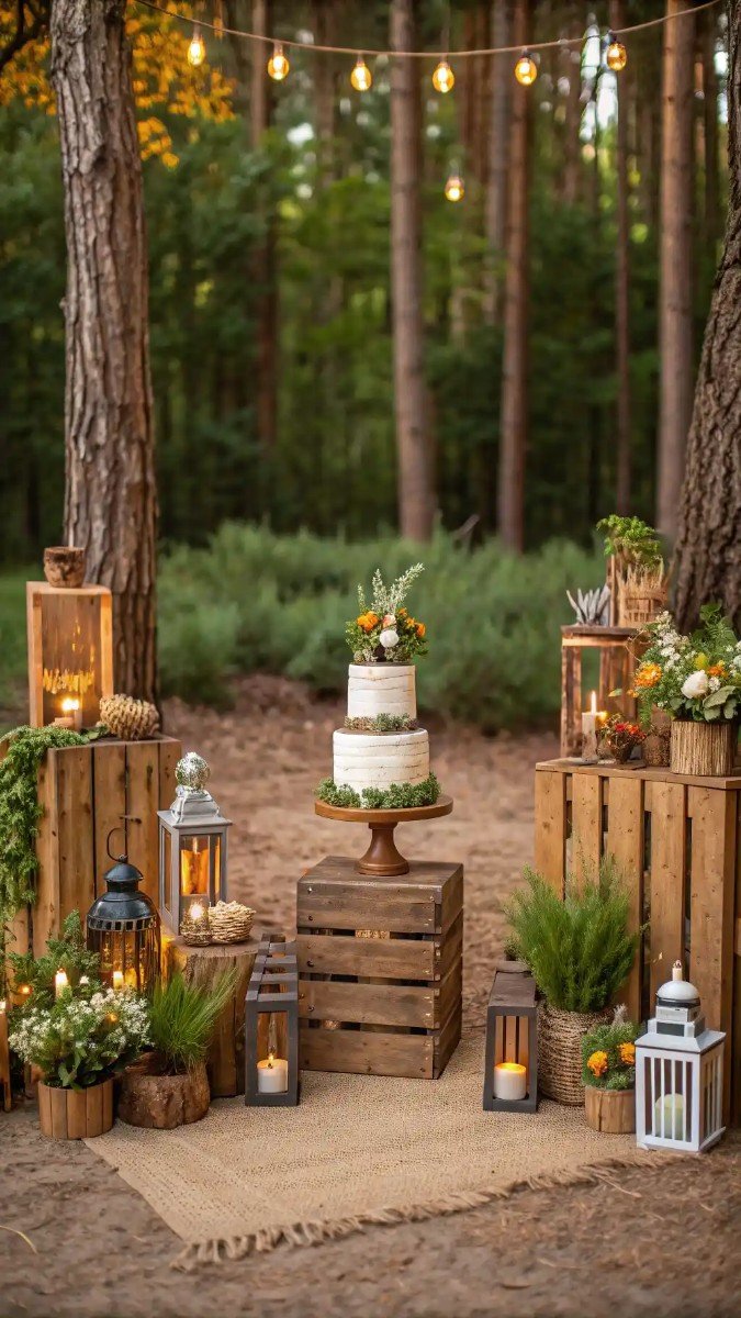 I find the use of reclaimed wood crates as risers and decorative elements incredibly effective. They provide varying heights, drawing the eye to the central cake display. The warm glow of string lights and lanterns casts a magical ambiance, essential for any special occasion. Incorporating natural elements like greenery and wildflowers further enhances the rustic charm.