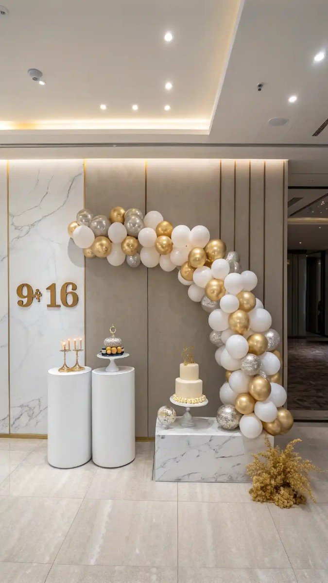 The use of balloons in a neutral color palette, paired with a delicate string of fairy lights and a personalized number display, creates a refined celebratory feel. This approach works because it complements the existing décor, enhancing the space without overwhelming it. The neutral color scheme allows for a versatile backdrop, easily adaptable to various tastes and preferences.