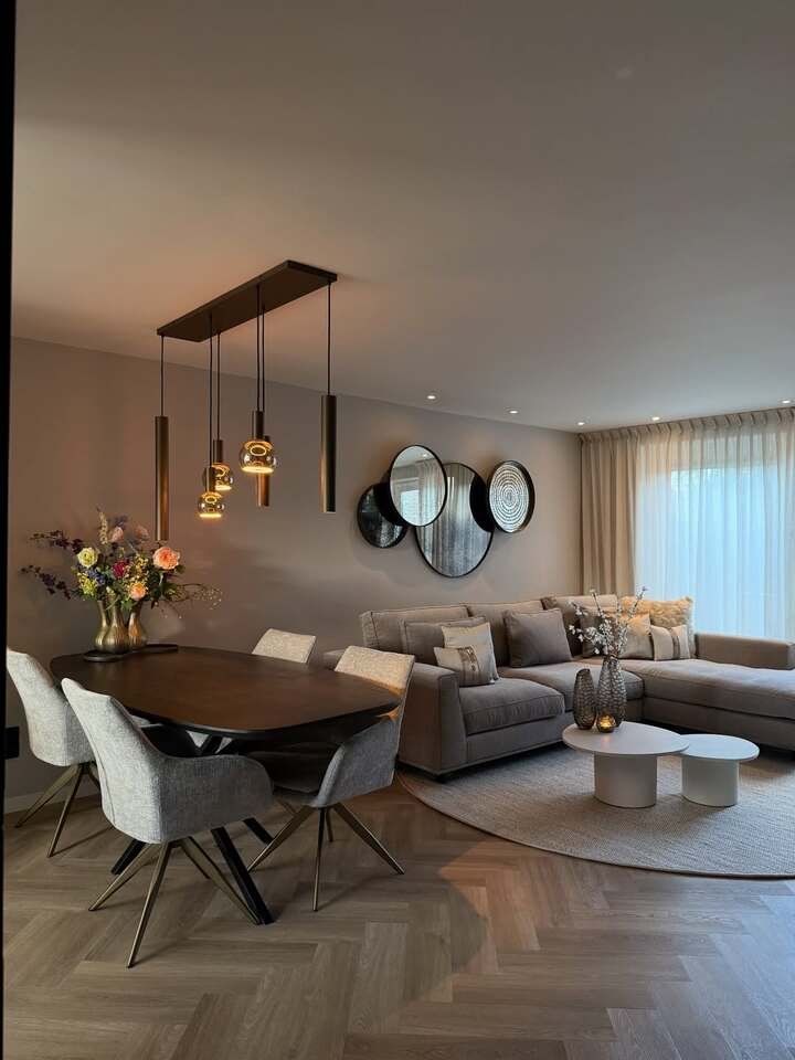 To pull off a design like this, think about adding sleek, contemporary furniture pieces that feel elegant but not too heavy. A well-chosen chandelier or pendant lamp can transform a basic dining table into the focal point of the room. Keep the color palette simple with whites, beiges, and a few metallic accents to maintain that sophisticated vibe.