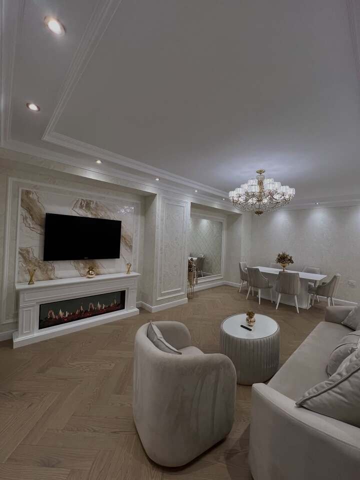 When I think about the word “luxury,” this design is exactly what comes to mind – minimal, elegant, and high-end. The combination of subtle tones and high-quality materials like marble and plush seating makes the space feel luxurious but not over-the-top. I love how the flat-screen TV is mounted on a pristine wall with detailed marble accents around the fireplace. The crystal chandelier hanging from the ceiling adds a sophisticated touch that immediately catches your eye without overwhelming the space.