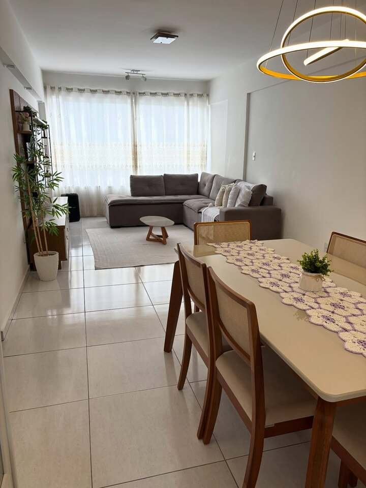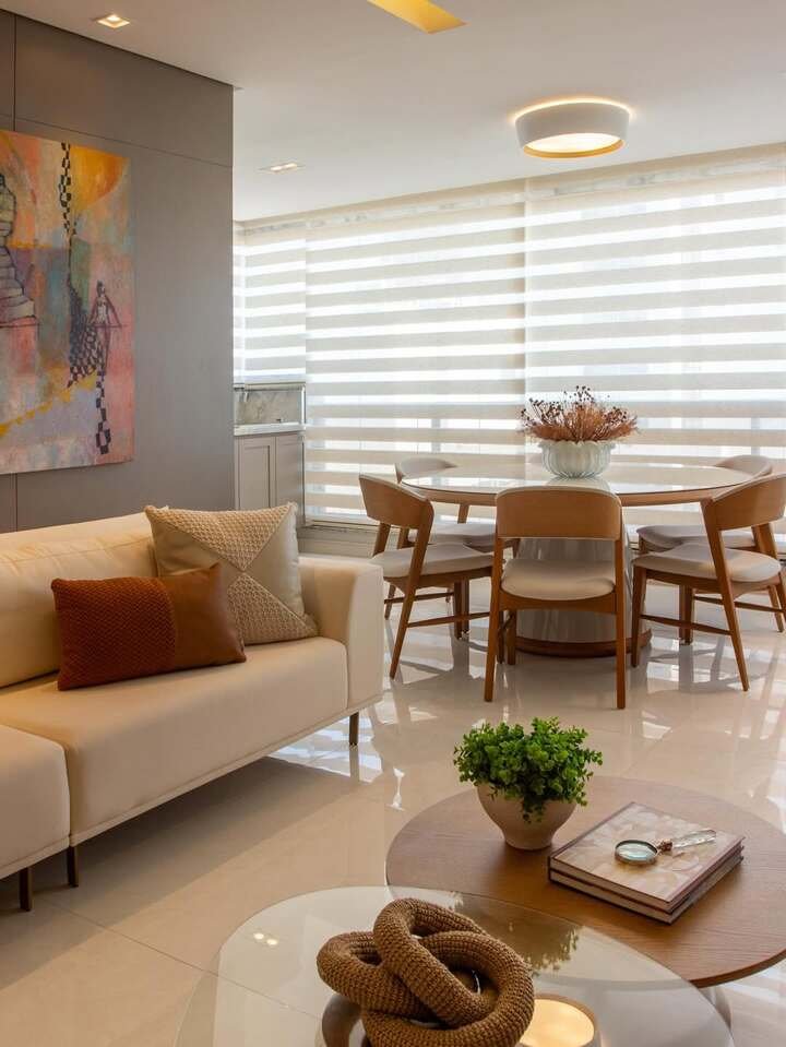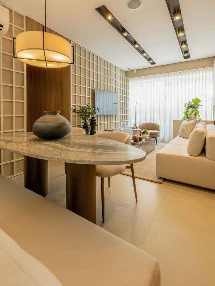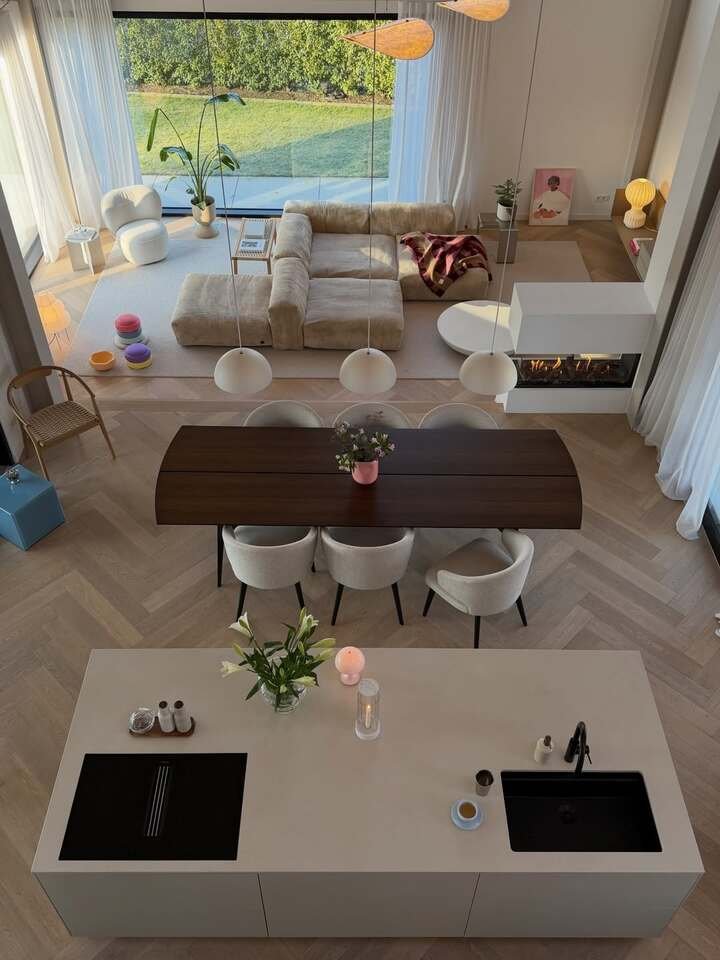 This design brings together modern elegance and a touch of nature. The dining area, with its clean, minimalistic design, is complemented by the soft textures of the sofa in the living room. The use of plants in the space adds life and color, creating a perfect balance between nature and contemporary design.