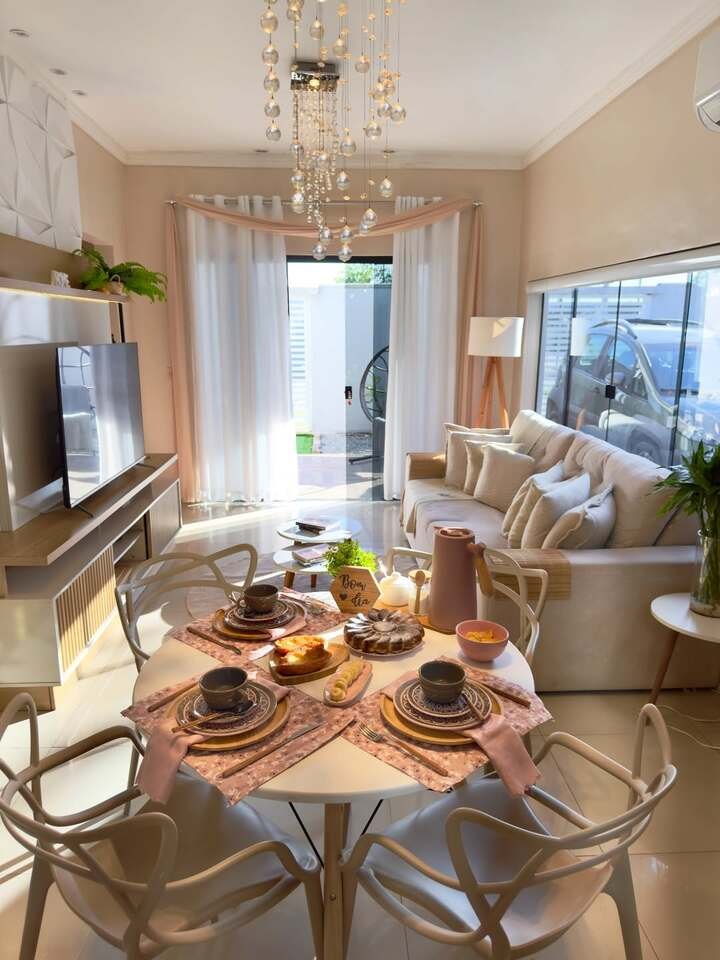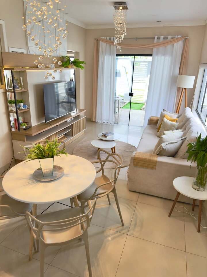 The addition of the stylish chandelier above the dining table enhances the elegance of the room, and the minimalist TV console on the opposite side maintains that clean, modern aesthetic. What I love most about this setup is how all the elements come together to create a calm and inviting space that is perfect for both entertaining and relaxing.
