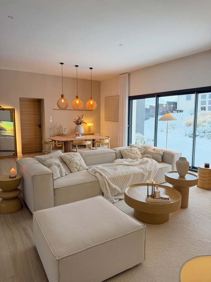 The beauty of Scandinavian style is how effortlessly it merges cozy warmth with modern simplicity. The large windows let in plenty of natural light, while the soft neutrals throughout the space provide a calm and inviting atmosphere. I especially love the natural wood elements mixed with comfortable textiles. The round dining table is surrounded by soft, padded chairs that invite guests to sit and relax.