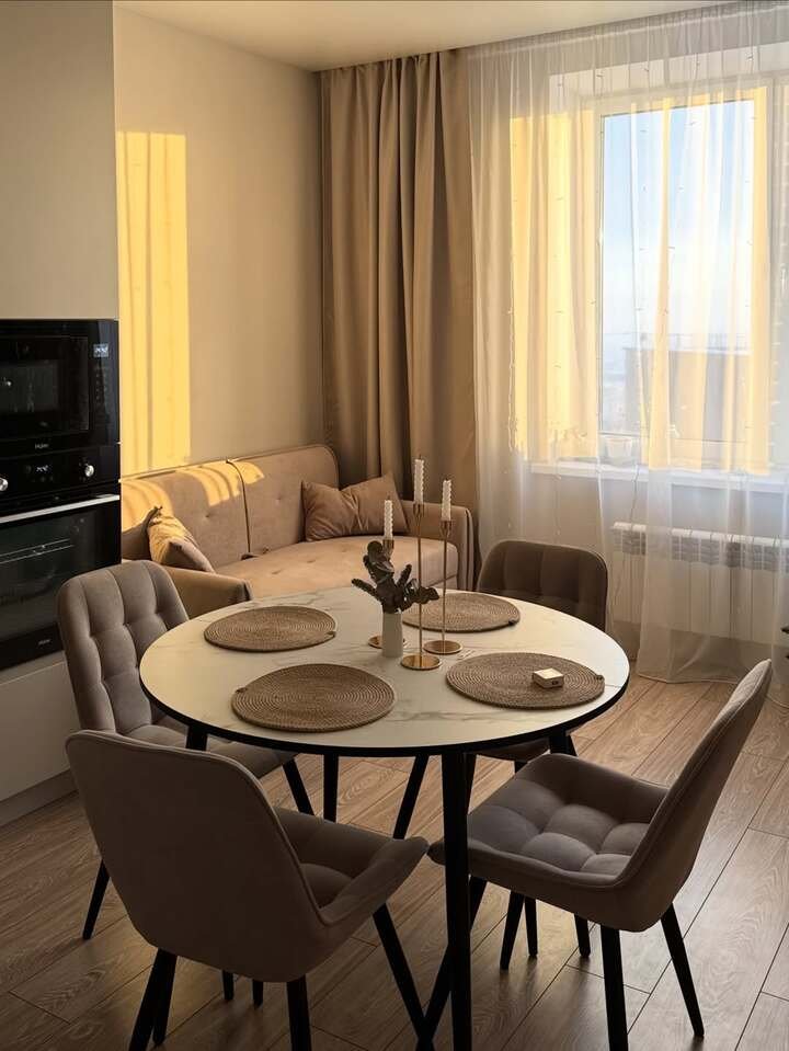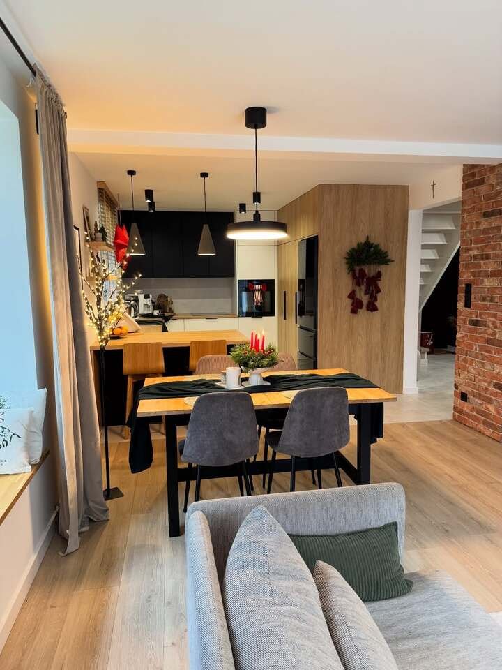 The inviting nature of this space immediately made me want to sit down and enjoy a cup of coffee. The modern decor mixed with soft, earthy tones creates a comfortable yet chic atmosphere. The sectional sofa in the living room is perfect for lounging, while the dining table invites family gatherings or casual dinners.