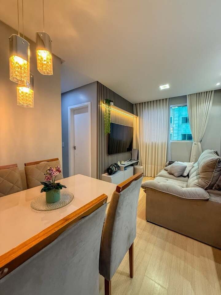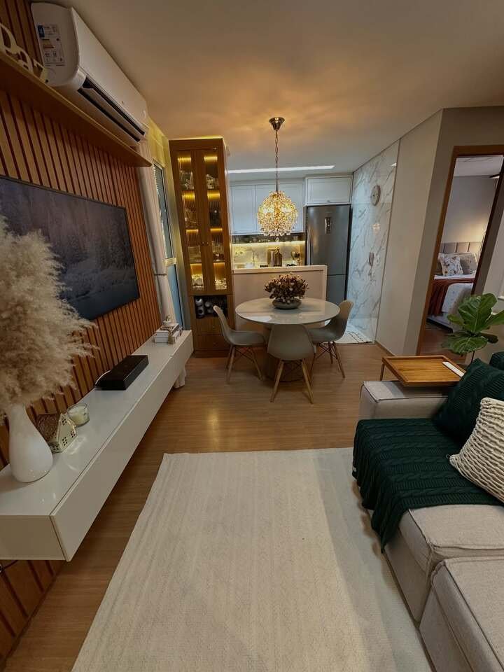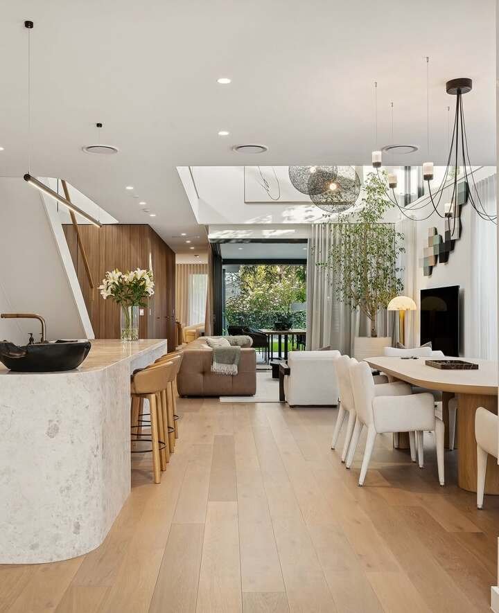 The light fixtures above the dining table and the soft, glowing lights in the living room enhance the space’s modern appeal. The combination of neutral tones with the natural elements like plants and wood makes this space feel both fresh and sophisticated.