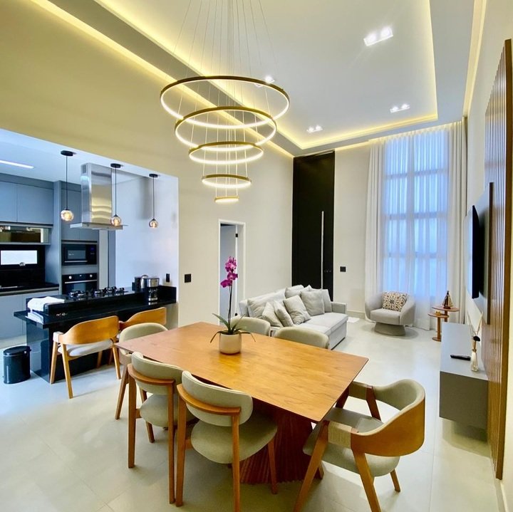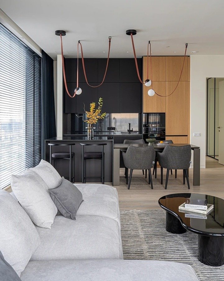 The lighting in this space is particularly striking – the combination of pendant lights and recessed lighting adds warmth and depth to the room. I also appreciate the use of natural materials, like the wooden dining table, which contrasts beautifully with the sleek, modern finishes of the room. The entire space feels cozy yet sophisticated, which is the hallmark of great design.