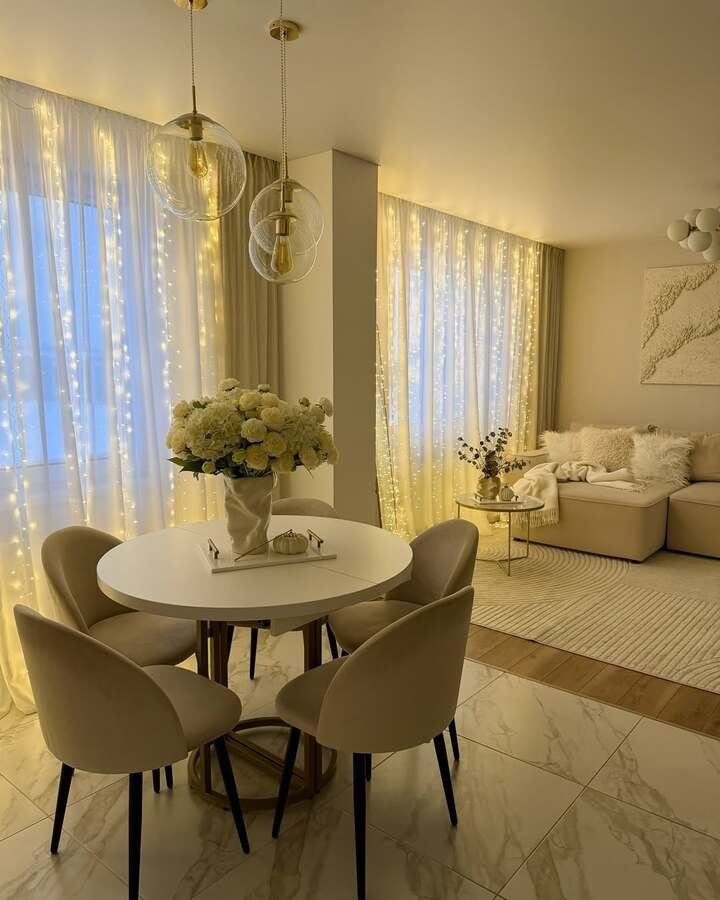 This stunning space oozes elegance with its bright and airy feel. The curtains, with their soft golden glow, add a touch of glamour, while the white dining table and neutral-toned chairs create a sense of calm. The pendant lighting above the dining table serves as a focal point, adding an element of sophistication without overwhelming the space.