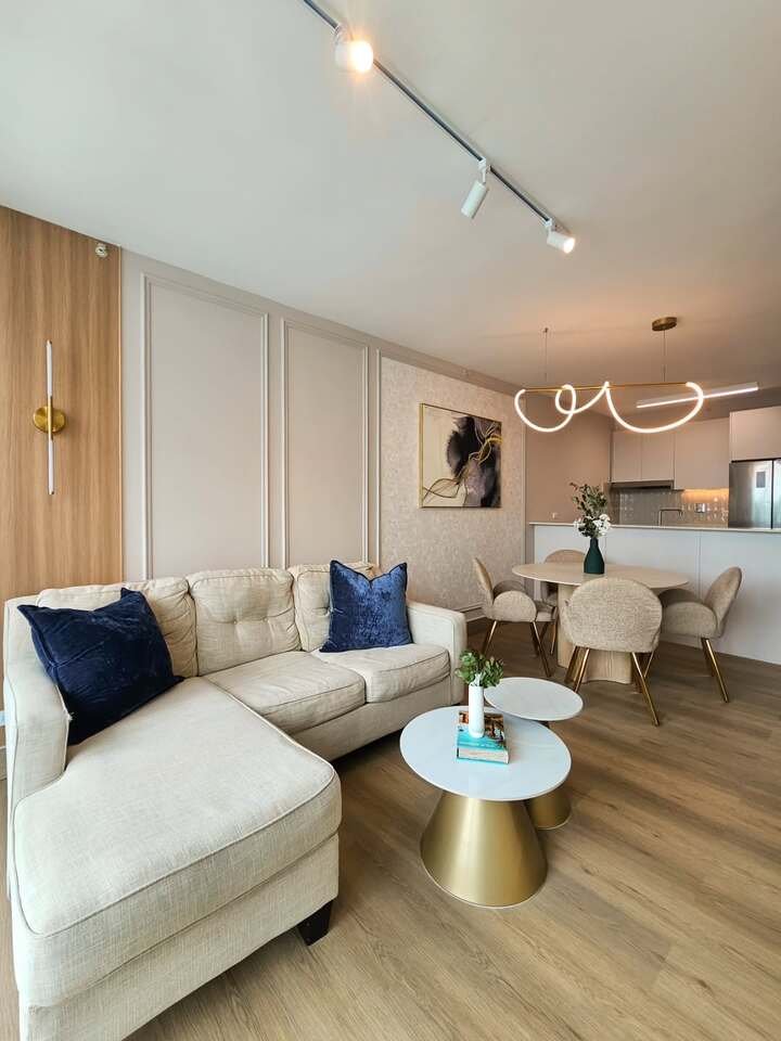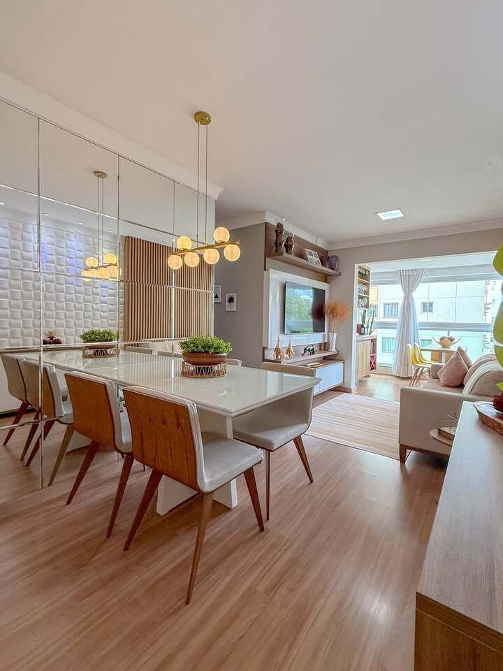 What really elevates this design is the careful use of accessories and lighting. The modern chandelier above the dining table adds a touch of glam, while the plush beige couch in the living area provides comfort and relaxation. I’m especially drawn to the use of mirrors to expand the space visually, making the area feel much bigger than it actually is. If you have a smaller space, using mirrors or glass furniture can help create a sense of openness and lightness in your home.