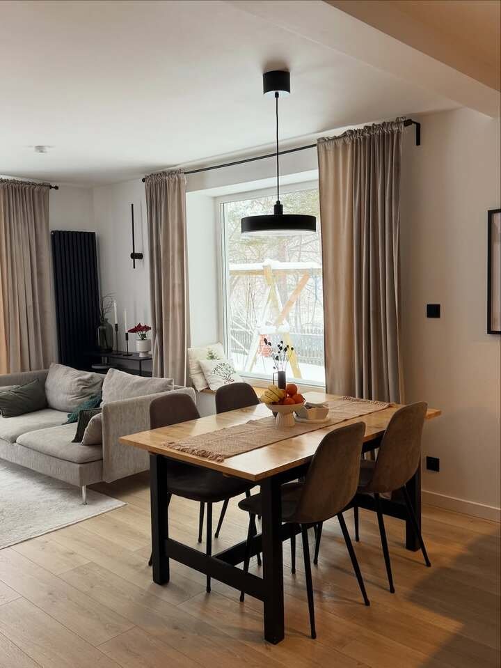 This Scandinavian-inspired design brings together modern elements with cozy, functional pieces. The dining table features simple yet elegant chairs, while the living area has a minimalist sofa that’s both stylish and practical. The space is light and airy, thanks to the big windows and the use of soft, neutral tones.