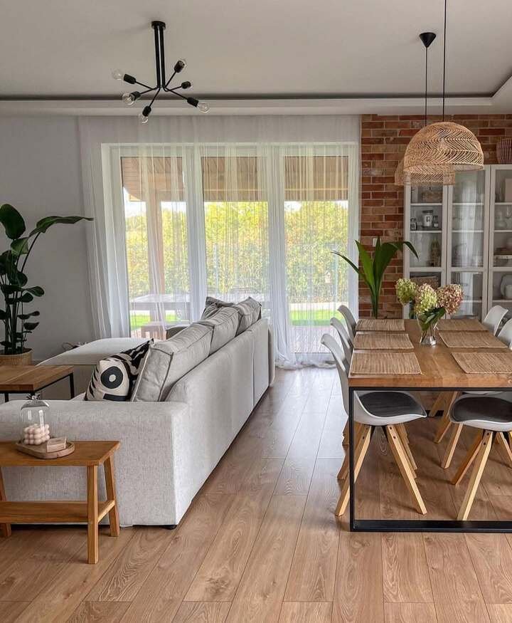This open living room dining room combo is all about maximizing space and light. The use of natural materials like wood, stone, and plants brings a fresh, earthy vibe to the space. The dining table and chairs are simple, yet their rustic charm adds character to the room.