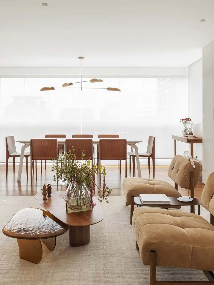 This space is one of my favorites because of its warm, neutral tones and elegant yet cozy vibes. The combination of a wooden dining table with rounded, comfy chairs creates a perfect balance of style and comfort. The soft fabric chairs in neutral tones blend seamlessly with the natural wood, creating a grounded, welcoming atmosphere. This combination works well for smaller spaces where you want both areas to feel connected but still distinct.