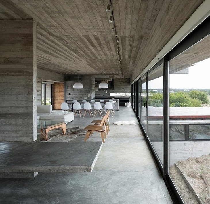 The second image shows another example of concrete flooring, but this time, it’s paired with an open, airy design that draws on natural elements. Here, the clean lines of the concrete floor perfectly complement the open space and simple furnishings. The natural wood chairs and light fixtures contrast beautifully against the cool, hard surface of the concrete, bringing warmth into the room. The large glass windows allow for an abundance of natural light, helping to balance the cool tones of the flooring with the bright outdoor view. This combination of natural and industrial elements creates a unique, inviting atmosphere that is perfect for modern living.