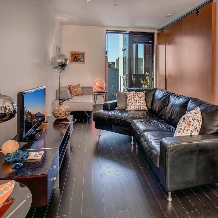 One of the first things I noticed about the living room in the first image is the striking dark hardwood floors. This type of flooring instantly brings sophistication and a sense of calm to a space, especially when paired with clean, contemporary furniture like the leather couch shown here. The dark wood contrasts beautifully with the natural light pouring in from the large windows, adding warmth to an otherwise cool-toned space.