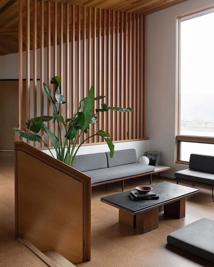 The second living room is totally different, but honestly just as beautiful. This room has a calm, minimalist feel with clean lines, wood panel dividers, and soft gray seating. The Cork Flooring living room flooring ideas here show how flexible cork can be. Even though everything is simple, the cork adds warmth so the room never feels cold or empty.