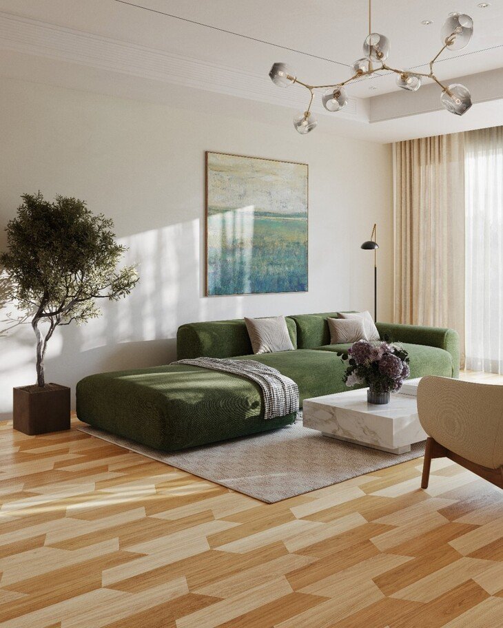 The first living room hit me the second I saw that leafy-green sofa resting on the most beautiful patterned vinyl flooring. Vinyl Flooring living room flooring ideas like this just feel special. The flooring has this natural light-wood look with a geometric pattern that feels modern but still gentle. It brightens the whole room, kinda like sunshine trapped inside the floor. When the light shines onto it, the vinyl looks warm and smooth, like something you’d want to walk on barefoot all day.