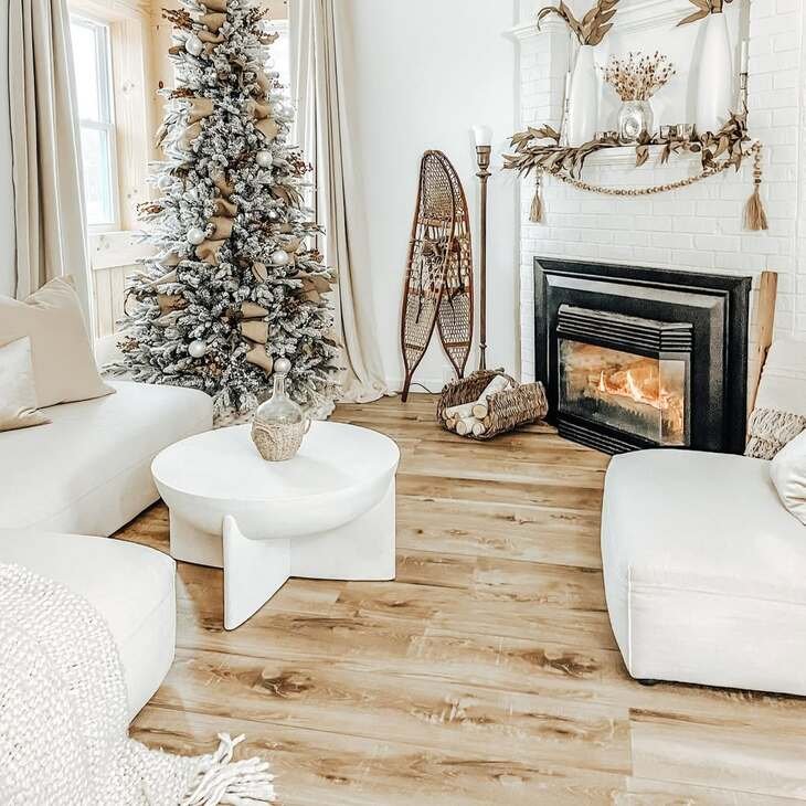 What I adore most is how the room leans into soft neutrals. The fluffy Christmas tree, the white sofa, the creamy curtains, everything feels gentle. The vinyl flooring balances it by adding warmth, so the space doesn’t look too cold or flat. Vinyl is also so easy to clean, which matters when you're decorating for holidays or dealing with everyday life messes.