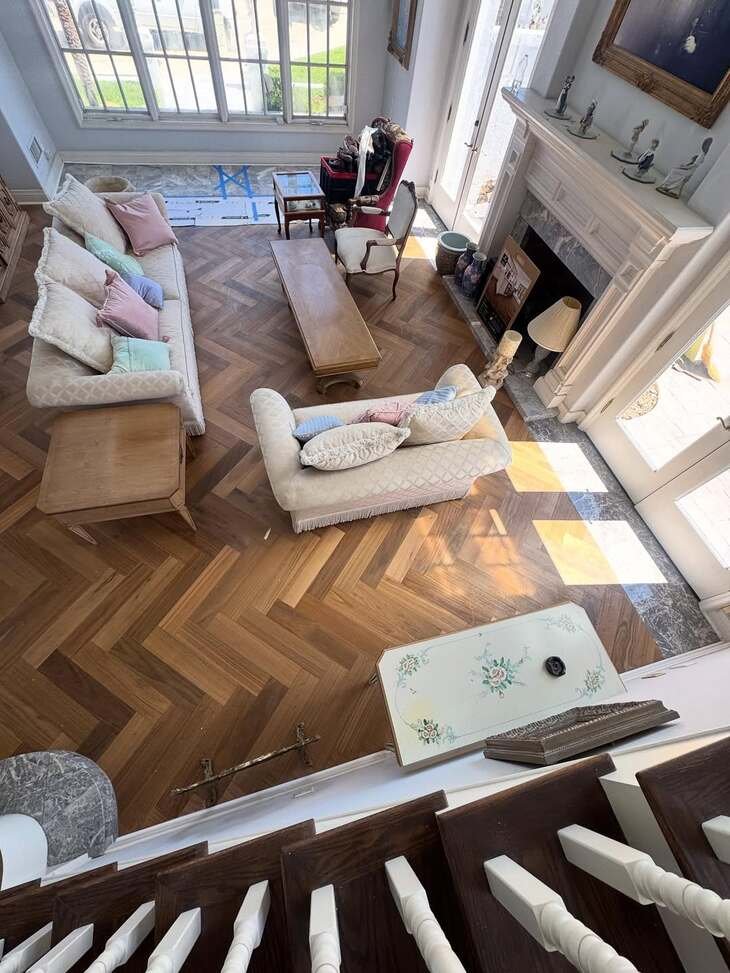 In this particular room, the herringbone wood floors beautifully complement the more traditional features of the space, such as the fireplace and antique-inspired furniture. The contrast between the rustic flooring and the elegant elements creates a perfect balance that feels both cozy and refined. Whether your home is contemporary or classic, herringbone flooring is one of those timeless styles that can adapt to nearly any living room setting.