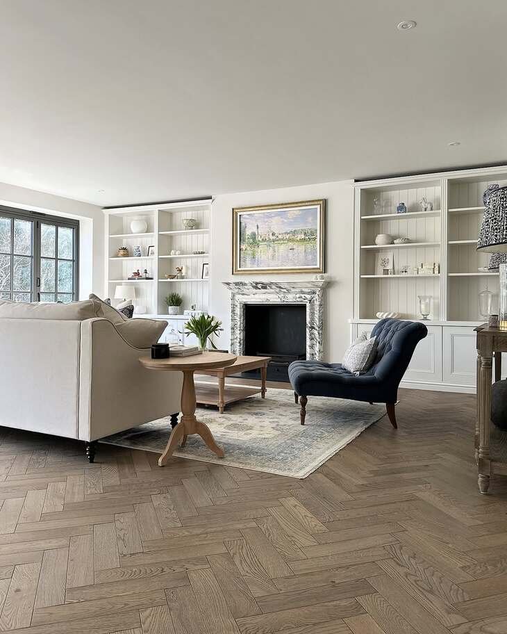This style of Herringbone Wood Floors pairs beautifully with traditional furniture. The soft pastel sofas, the carved wood tables, and the antique-style chairs all look like they belong together. The herringbone pattern brings movement to the room, creating this rhythm that feels satisfying and warm. It’s the kind of room that makes you want to curl up with a blanket and read a long book even if you don’t like reading.