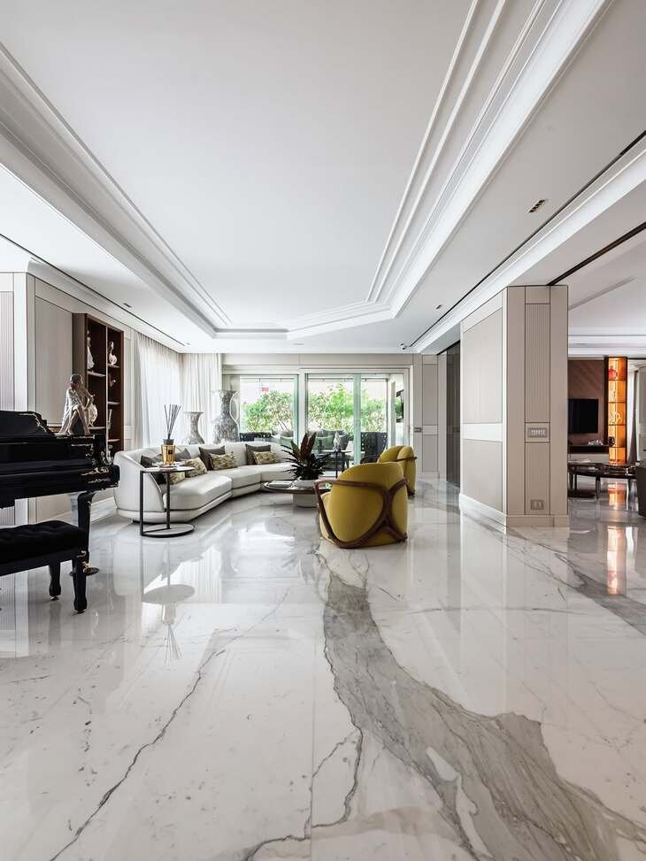 This living room embraces an open layout that flows seamlessly from the elegant piano to the large glass doors leading to the outdoors. The furniture is arranged to maximize the use of space while the marble flooring remains the focal point. The reflective surface of the marble tiles brings in a sense of airiness, making the room feel even larger and brighter.