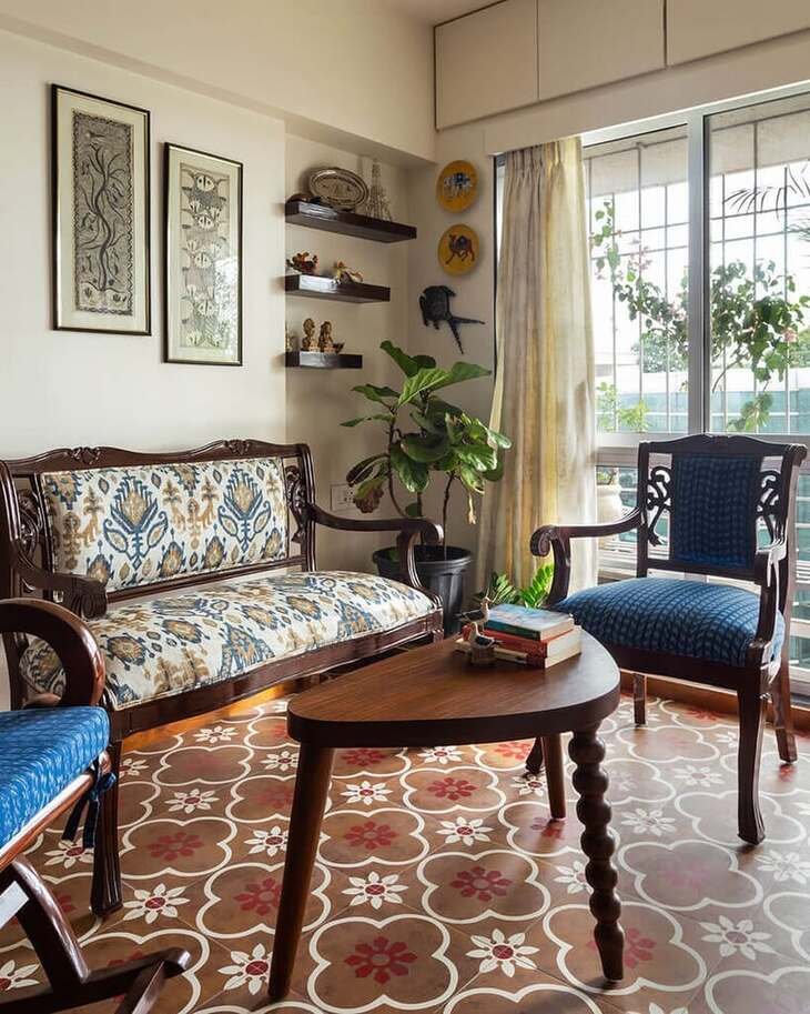 What makes this design stand out is the way the patterned tiles effortlessly complement the classic wooden chairs and modern accessories. The combination of the tiled flooring with vintage-style seating creates an ambiance that's both nostalgic and contemporary. The sunlight streaming in through the windows only highlights the warm tones of the tiles, making this living room feel even more inviting.
