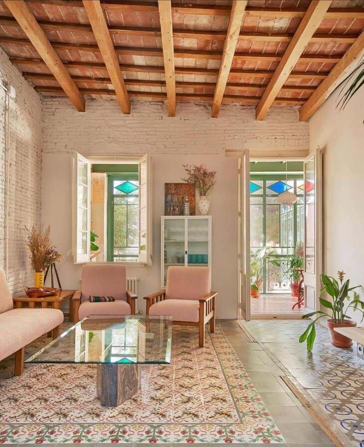 The overall design of this room is carefully curated to balance texture, color, and light. The natural wooden beams on the ceiling, the exposed brick wall, and the rustic furniture help bring a natural, earthy feel to the room. The patterned tiles add an artistic touch, making the flooring not just functional but a focal point that ties the entire room together.
