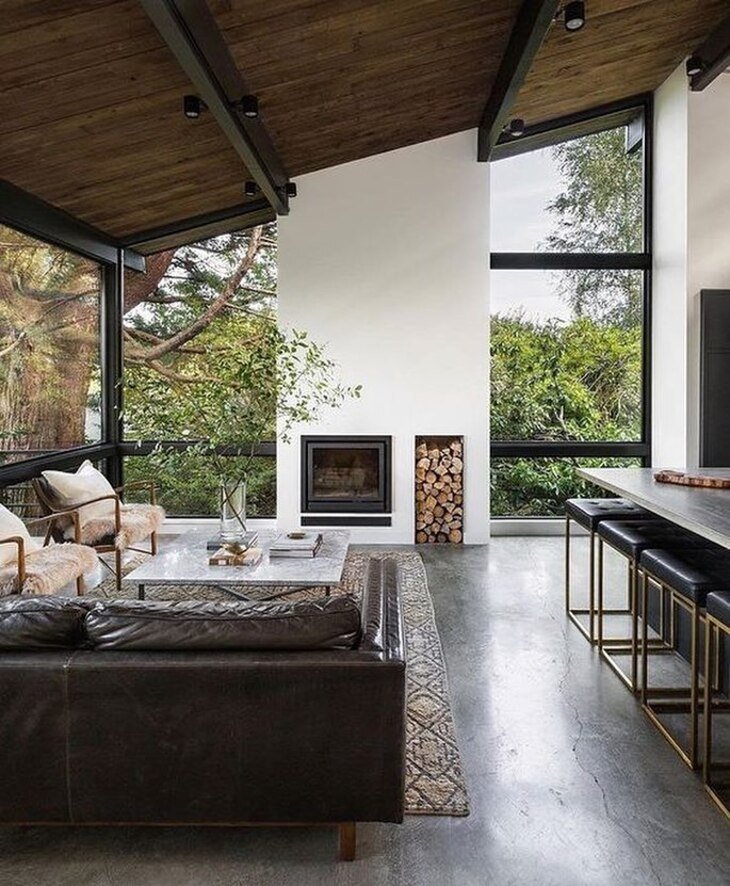 The first image shows a spacious living area with concrete flooring, which brings a raw, industrial feel to the space. The sleek, polished concrete floor complements the minimalist design of the room. The natural light pouring through large windows enhances the modern aesthetic, creating a seamless connection with the outdoors. The concrete floor not only adds a contemporary touch but also provides durability and easy maintenance, perfect for homes that favor clean lines and functional design. The furniture choices, such as the leather sofa and minimalist coffee table, elevate the urban feel while still maintaining comfort and style.