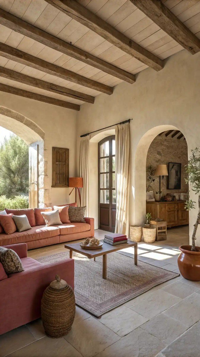 What draws me to this is the incredible warmth and rustic charm of the space. The exposed ceiling beams and stone arches immediately convey a sense of history and permanence, providing a wonderful counterbalance to the softer elements within the room. And I particularly appreciate the way natural light floods in, highlighting the textures and colors.