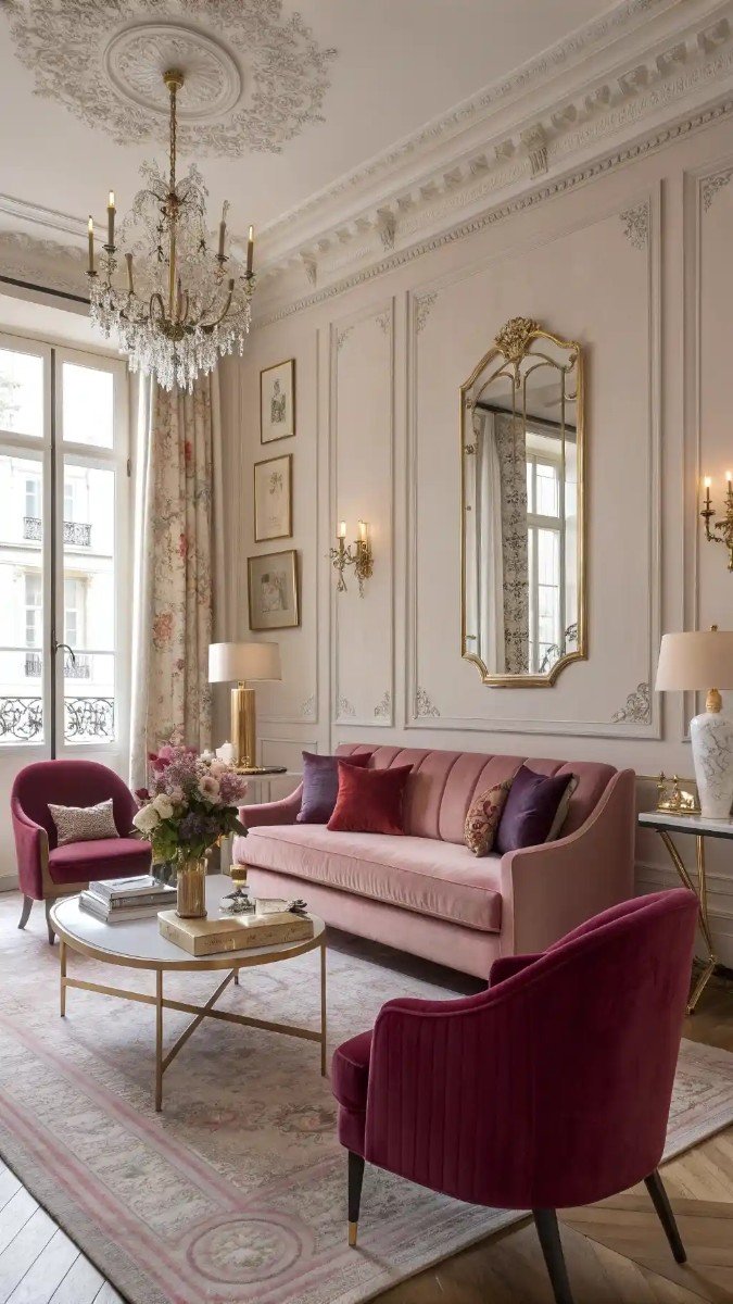 I've always believed that color plays a pivotal role in setting a room's mood. Here, the use of a pink purple red living room palette creates a truly inviting and sophisticated space. The soft pink sofa beautifully anchors the room, while the deeper red armchairs add a touch of drama and warmth.