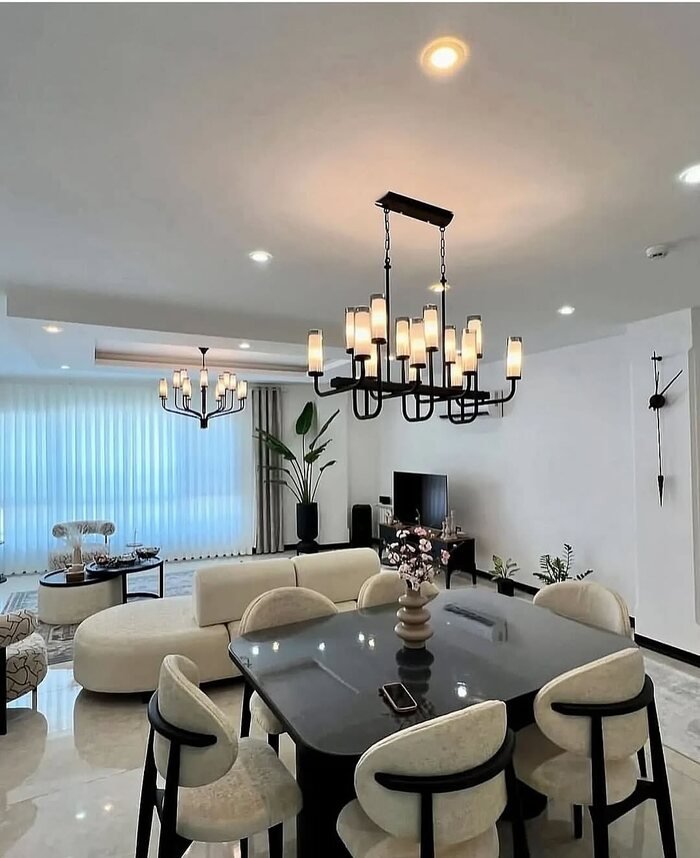 Here’s one of my favorites—a design that feels like a bridge between the future and the past. The blend of modern light fixtures with timeless furniture, such as plush dining chairs, makes for an effortlessly stylish room. The geometric light fixture is the standout, but it doesn’t overpower the other pieces. Instead, it complements the room’s warmth and coziness.