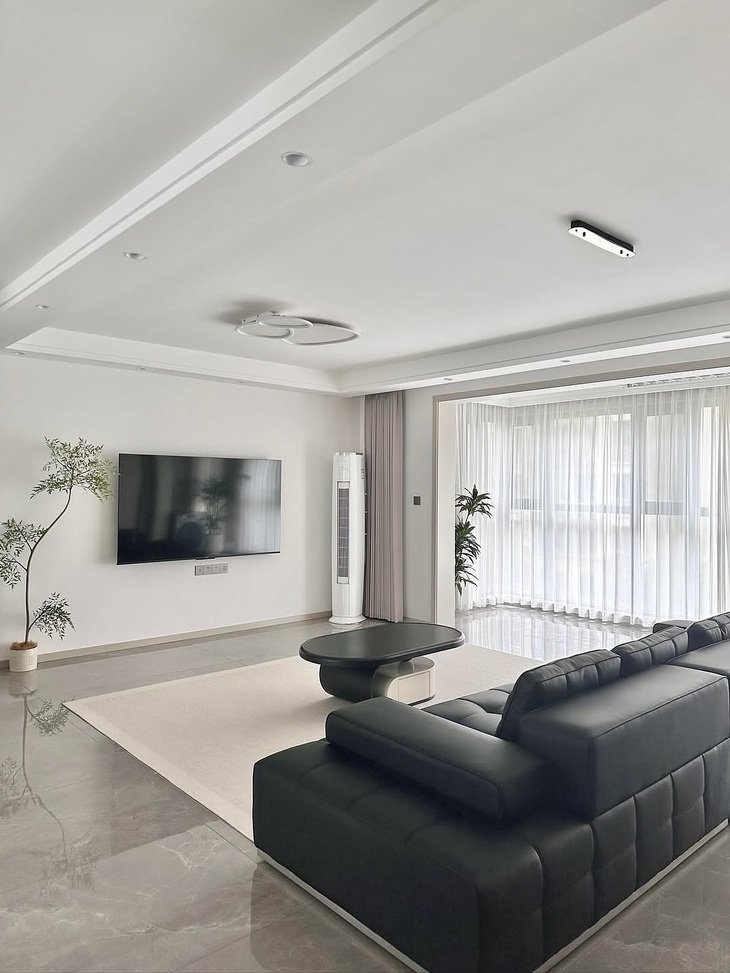 This Grey Marble Living Room features a sleek, modern design with glossy grey marble flooring that enhances the room’s spacious and luxurious feel. The minimalist décor, black sectional sofa, and soft natural lighting create a calm and elegant atmosphere. Floor-to-ceiling curtains and simple greenery add a touch of softness and balance to the contemporary interior.