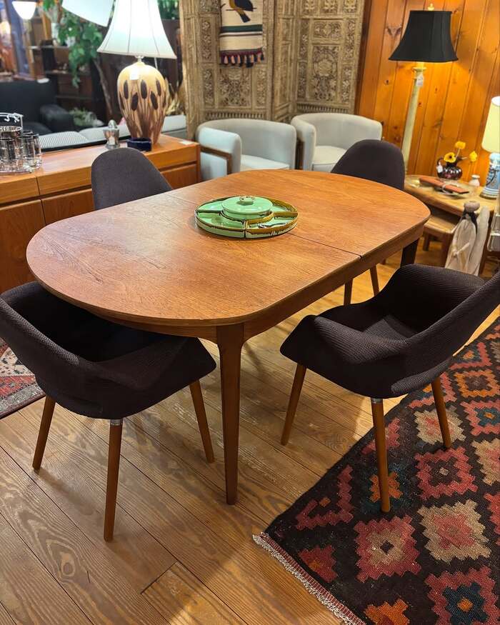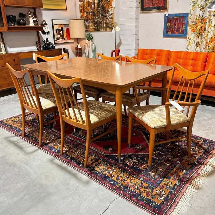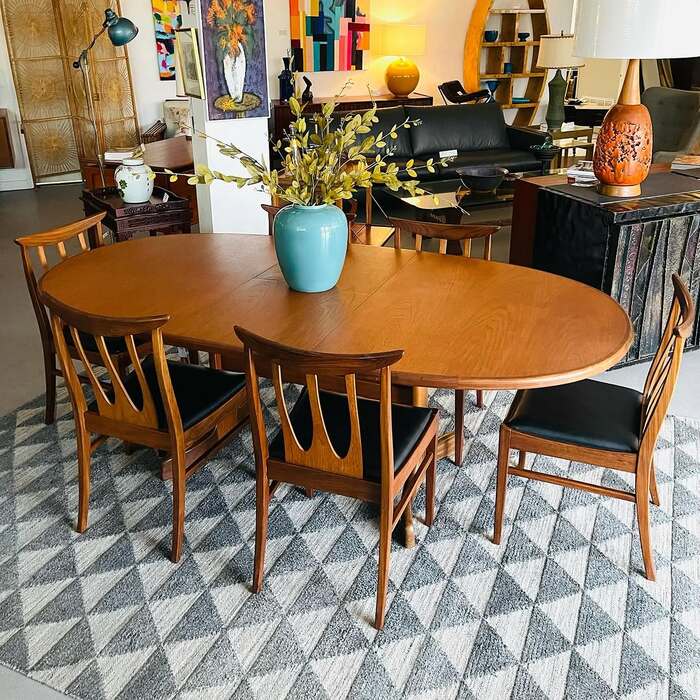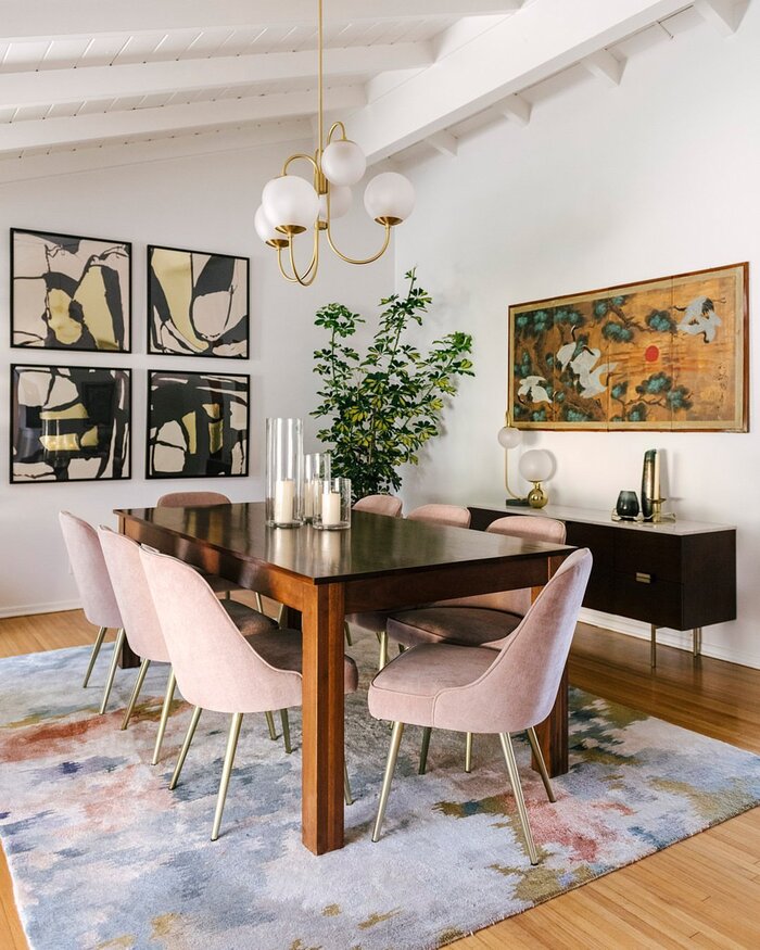 This is classic mid century modern dining room ideas territory. Keep tabletop styling simple, maybe a stone bowl, so the rug can sing.