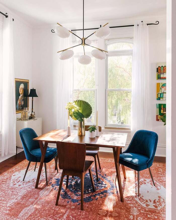 Blue velvet, slim walnut table, and the happiest rug on the block. The sputnik light gives playful sparkle without taking visual space.