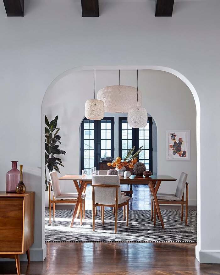 Arched doorway, airy paper shades, oatmeal seats. Everything is gentle so the wood reads loud and clear. This is your quiet-lux version of mid century modern dining rooms.