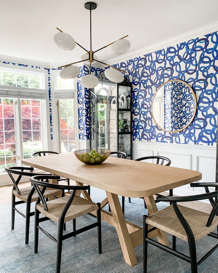 If you want mid century dining room drama without paint everywhere, try one saturated accent wall plus a single glamorous light.