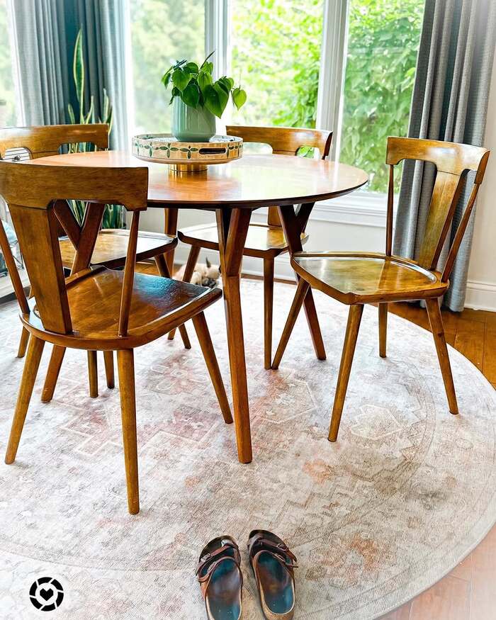 Curved-back chairs and a circular rug fit like a puzzle. Rounds are my favorite mid century dining table ideas for tight spaces because traffic flows better and knees stop bonking.