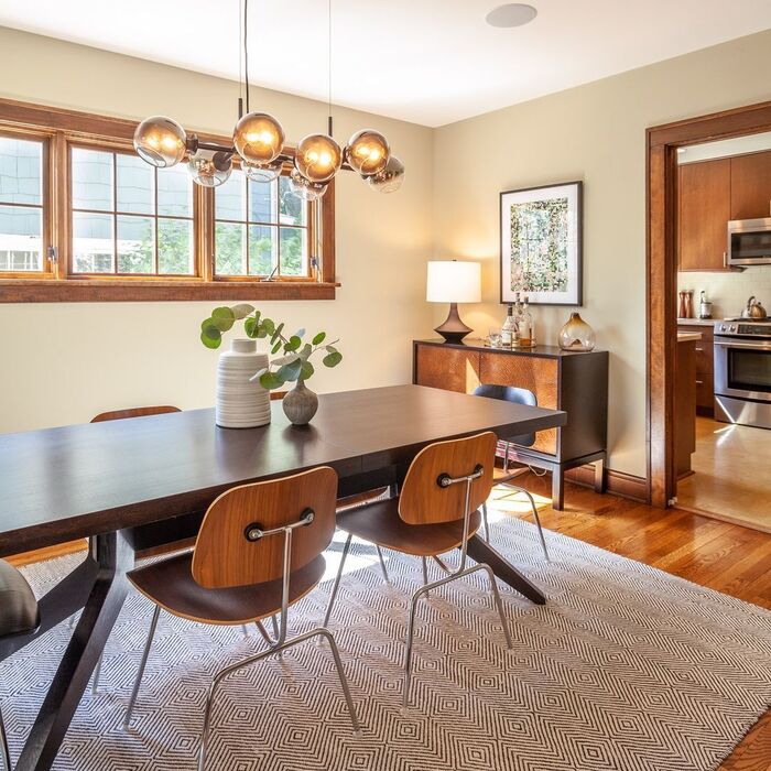 I use this plan in rentals all the time. It’s budget friendly mid-century style dining room problem solving.