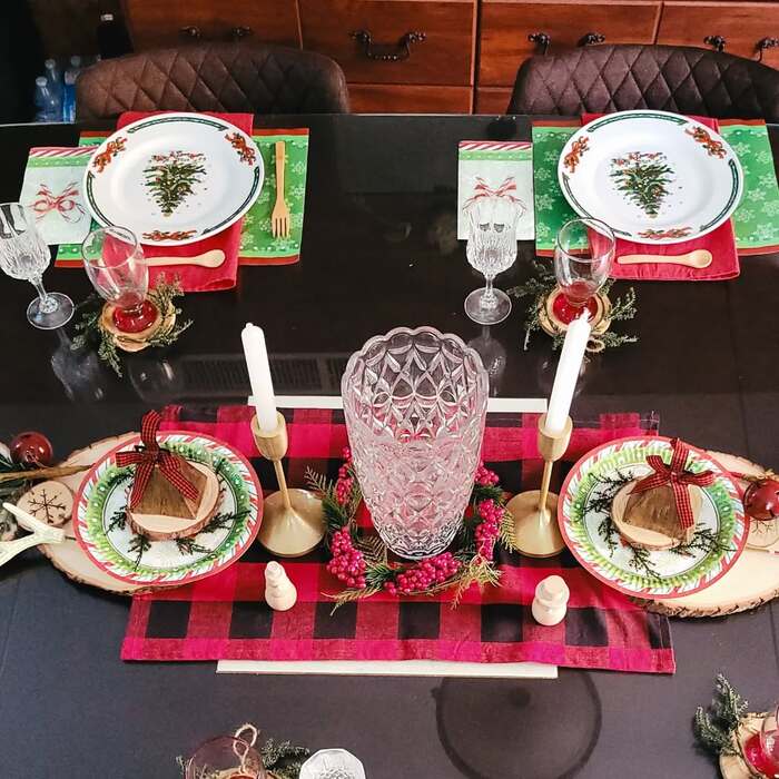 This last one is proof that you can be minimal and still playful. A narrow buffalo check runner anchors the table. Gold candlesticks frame a simple evergreen ring. Each place setting stacks a dinner plate with a smaller patterned plate, then a wood slice coaster and a tiny bundle of greens tied with ribbon. The layers are controlled, not messy. It’s minimal Christmas decorations that still feel like a party.
