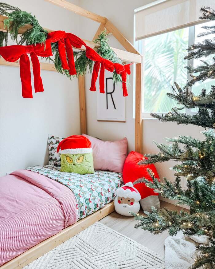 This kid room makes me smile even before coffee. A simple pine garland drapes across the little house frame, tied with oversized red bows. The bedding keeps to red and green, and a friendly Grinch pillow does the playful work so the rest can stay minimal. This is family-friendly minimalist holiday decor because the parents still have room to move and the kid can actually nap.