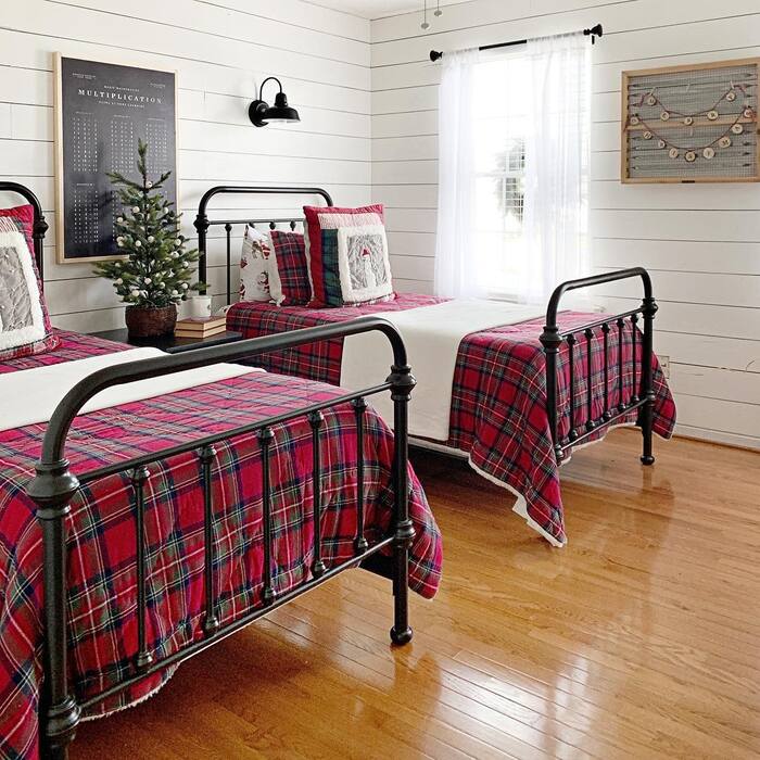 Two black metal beds with matching red tartan quilts might be the fastest way to make a room feel like December. The shiplap walls and wood floors already handle texture, so the decor can stay lean. A tiny potted tree on a stack of books is all you need between the beds. I vote for warm white lights only. The plaid handles color, the tree handles twinkle, boom. That’s minimalist christmas decor in a shared room that still photographs cute.