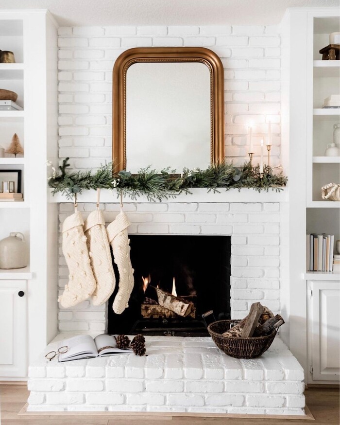 16) White Brick Mantel With Brass Mirror and Knit Stockings