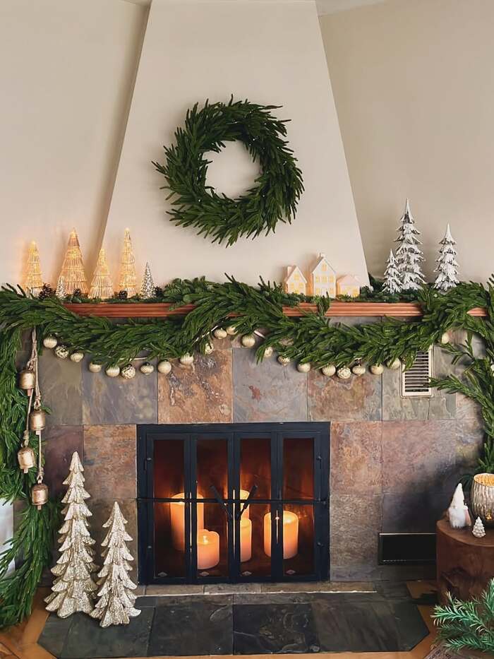 Here we keep the bones natural and let one material shine. A deep green garland drapes along the mantel with a string of small gold baubles below it. A single laurel wreath holds the center. I can’t explain it fully but the symmetry calms my brain. Clustered candles behind the fireplace screen give that fireside glow even if you’re not burning a log. If your fireplace stone is busy, this simpler approach to minimal Christmas decorations is perfect.