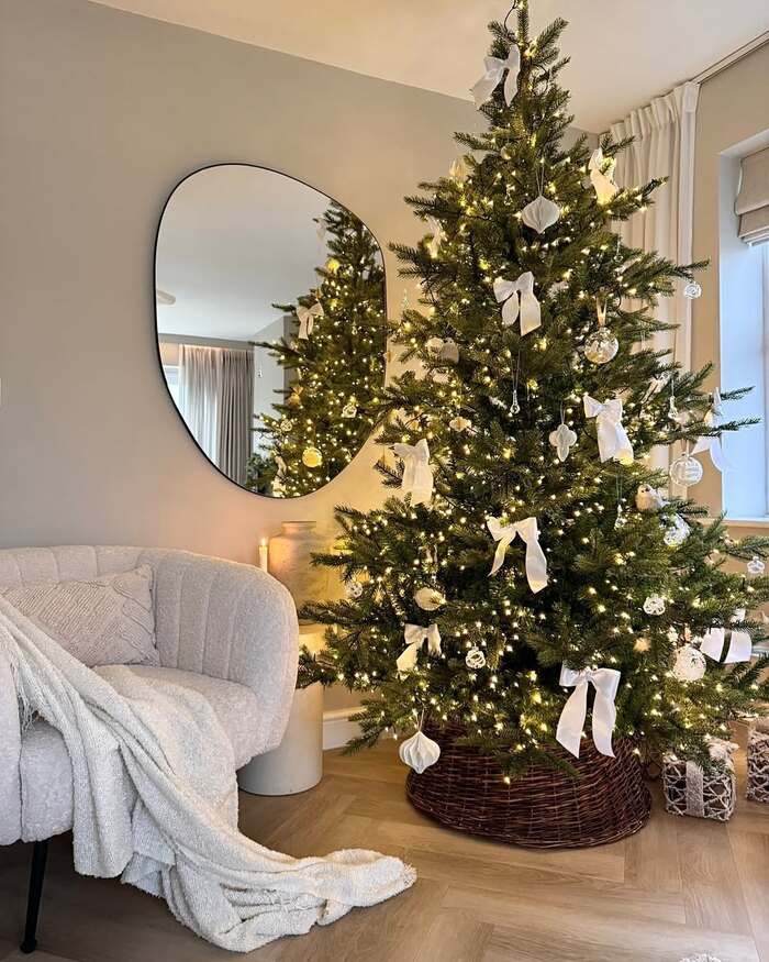 The secret hero here is the basket. The tree sits in a wide wicker collar that hides the stand and brings instant texture. Ornaments stay light and airy. Clear glass balls, a few white ones, and soft white bows tied near the tips. It sparkles without heaviness. I keep repeating it but texture matters. Basket, knit throw, boucle chair. Those layers are why this minimalist christmas decor still feels cozy.