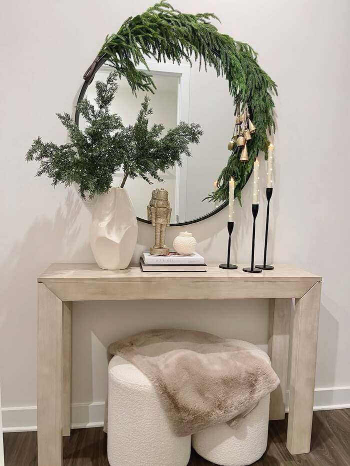 Use floral wire to attach the greens to the mirror frame, not tape, so it stays put. Hang a cluster of little bells at the drop point for a tiny chime when the door opens. Keep the console surface pale so shadows show. If your mirror is rectangular, aim the greenery down one side only. The asymmetry is what makes this modern minimalist Christmas setup feel designed instead of accidental.