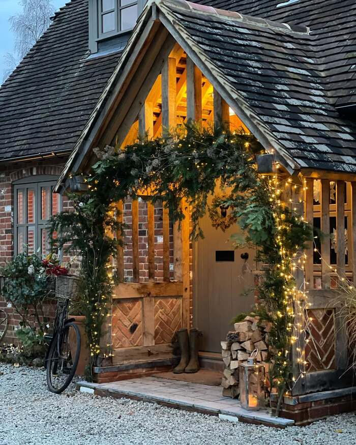 This little cottage entry is proof that one strong move beats twenty small ones. A thick arch of cedar, fir, and ivy wraps the timber porch with warm fairy lights. The rest is useful stuff that also looks pretty. Boots by the door. A stack of split wood. A single lantern with a real candle. The scale feels generous and the minimalist christmas decor mood stays intact because the palette never wanders.