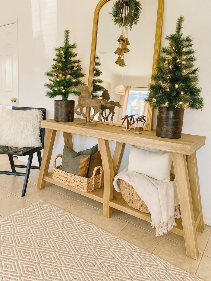 Our last idea doubles the tree trick. Two tabletop pines in dark pots flank a gold mirror. Underneath, baskets hold blankets and pillows you actually use. A little herd of metal reindeer marches across the top. The light wood console adds warmth and shows off texture without needing lots of color. This is minimalist christmas decor that works every day through winter.