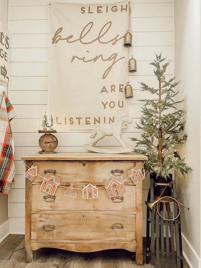 This vignette makes my heart do a quiet little jingle. A simple banner spelling “sleigh bells ring” hangs like fabric art, and everything else whispers along with it. The vintage dresser brings soft, worn wood that warms the white shiplap, while a paper gingerbread garland runs across the drawers like a kid-sized parade. One skinny tree in a black stand gives height without hogging attention, and the cluster of metal bells pulls the ear in the best way. It’s the kind of minimalist christmas decor I want right by the back door, where we drop boots and breathe for a second.