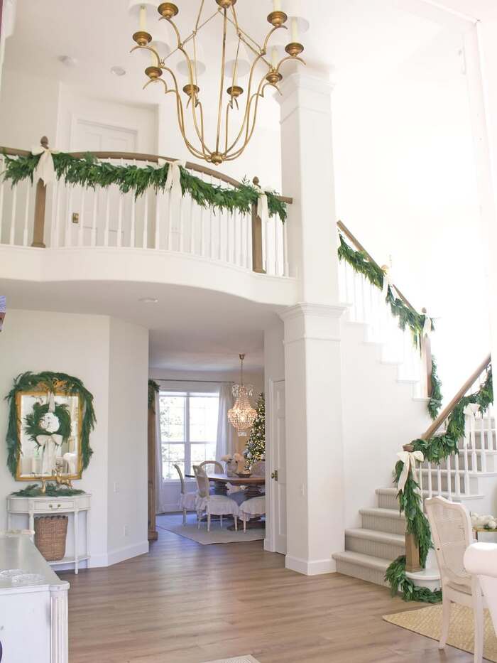 That foyer is textbook calm. A single long garland rides the banister, tied with soft off-white bows that match the trim, and nothing else fights for attention. The light floors and curved railing already do a lot visually, so the greenery acts like eyeliner for the architecture. If you’ve ever felt your entry gets busy fast, this is the version of minimalist christmas decor that saves your sanity and still feels festive from the street.