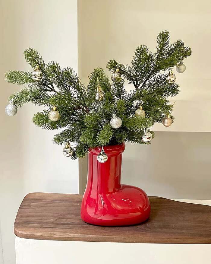 Steal the look with what you already have. Snip branches from the back of your tree or ask the tree lot for clippings. Trim stems at an angle, strip the lower needles, and drop them into water with a pinch of sugar and a copper coin. They’ll last two weeks easy. Hang mini ornaments close to the tips so they don’t drag the stems down, and keep all the baubles in one metal family to avoid visual noise. Slide a felt coaster under the boot to protect wood surfaces, then flank it with nothing more than a candle or a tiny stack of holiday cards. If you want a calmer palette, swap the boot for a white utensil crock and call it modern minimalist Christmas. Same idea, same joy, still tidy.